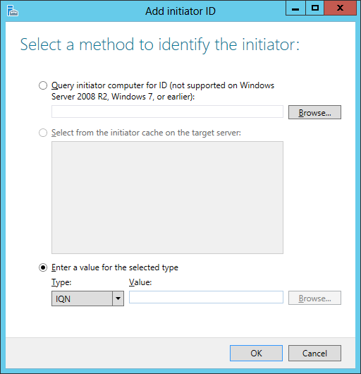 На этом шаге, при добавлении инициатора из Active Directory может возникнуть ошибка "Unable to determine IQN for <FQDN>". В этом случае IQN инициатора можно ввести вручную, выбрав метод Enter a value for the selected type. Например, чтобы узнать IQN инициатора на клиенте в Windows 2012 или Windows 8, следует в панели управления открыть iSCSI Initiator Properties и на вкладке Configuration в поле Initiator Name будет прописан требуемый IQN.