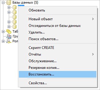Запускаем pgAdmin - подключаемся к серверу - кликаем правой кнопкой мыши по базе, для которой хотим восстановить данные - выбираем Восстановить: