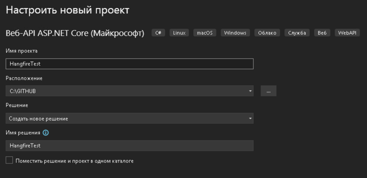 Укажите имя проекта HangfireTest, а затем укажите местоположение