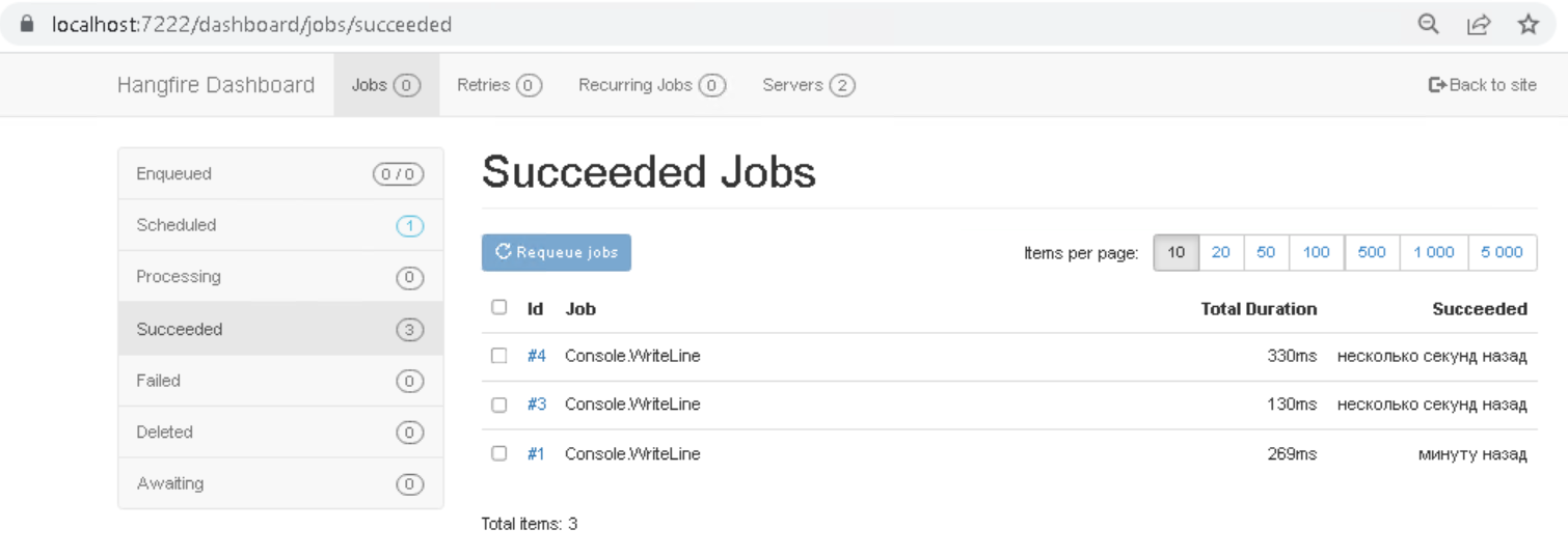 Панель инструментов показывает все запущенные и запланированные задания, которые мы создали с помощью нашего клиента Hangfire. Мы также можем отслеживать серверы, повторные попытки и неудачные задания, а также отслеживать все задания в очереди. Еще одна замечательная вещь, которую мы можем сделать на панели инструментов, — вручную запускать существующие задания.