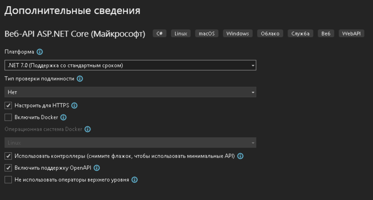 Предоставьте некоторую дополнительную информацию, например .NET 7, настройте для HTTPS и включите поддержку Open API.
