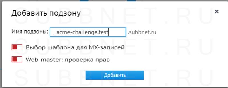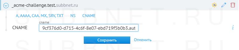 Но если вы попытаетесь получить сертификат для субдомена, клиент предложит вам добавить запись CNAME для этого субдомена: