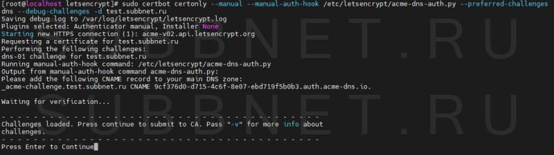 sudo certbot certonly --manual --manual-auth-hook /etc/letsencrypt/acme-dns-auth.py --preferred-challenges dns --debug-challenges -d test.subbnet.ru
