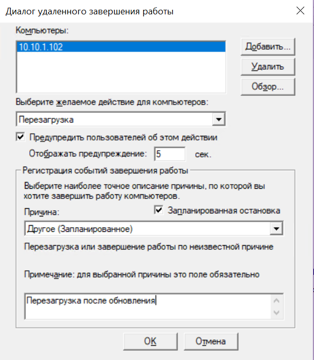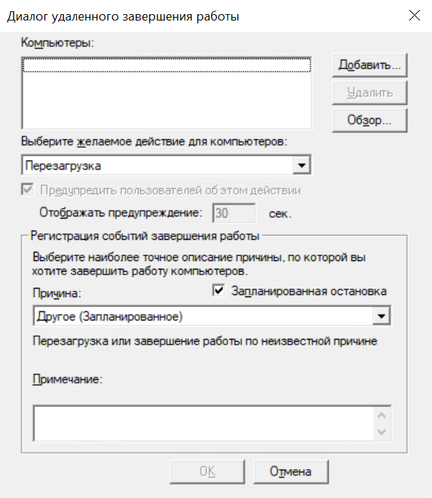 Использование команды завершения работы Windows для перезагрузки удаленного компьютера