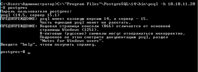 sudo psql -h 10.10.11.20 -U postgres* где 10.10.11.20 — IP-адрес сервера баз данных; postgres — имя учетной записи, от которой идет подключение.