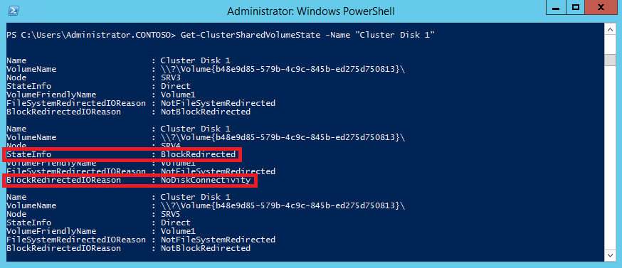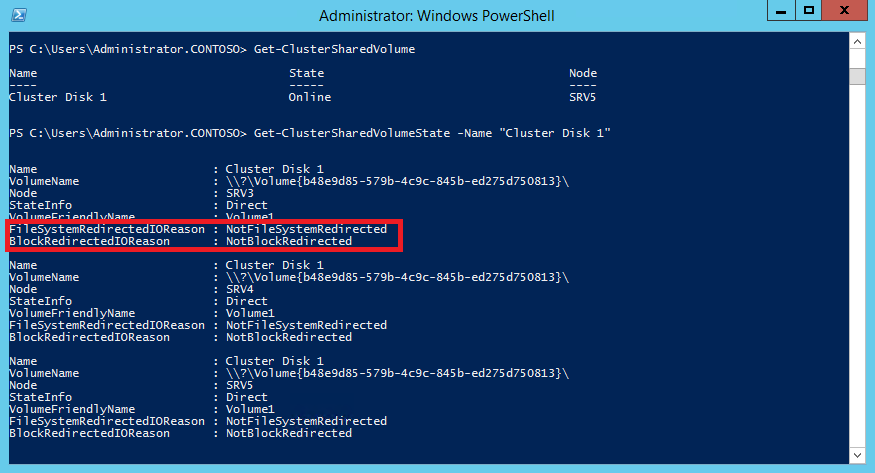 Get-ClusterSharedVolumeState -Name ″Cluster Disk 1″Как видите, сейчас все узлы работают в штатном режиме (Direct), без перенаправления.