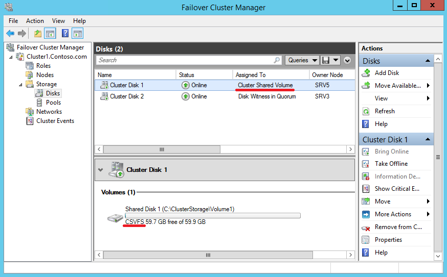 После преобразования диск отображается как общий кластерный том (Cluster Shared Volume), а в качестве файловой системы у него CSVFS. Впрочем на самом деле файловая система осталась прежней, а CSVFS показана лишь для того, чтобы администратору и приложениям проще различать обычные и CSV тома.