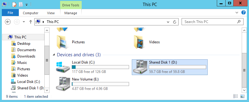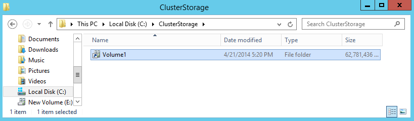 В проводнике же диск теперь виден не как обычный том, а как подключенная папка. Все диски после добавления в CSV отображаются на всех узлах кластера как подкаталоги в папке %systemdrive%\ClusterStorage и по умолчанию именуются как Volume1, Volume2 и т.д. Так в нашем случае общий том имеет путь C:\ClusterStorage\Volume1. Каталог Volume1 при желании можно переименовать, дав ему более осмысленное название, а вот папку ClusterStorage нельзя ни в коем случае трогать.
