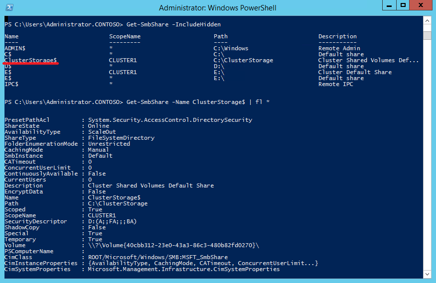 Remove-ClusterSharedVolume -Cluster Cluster1 -Name ″Cluster Disk 1″И еще один интересный момент. На каждом узле кластера с CSV создается скрытая административная шара с именем ClusterStorage$. Она доступна только для членов группы администраторов, на нее можно зайти удаленно по пути \\«имя кластера»\ClusterStorage$, в нашем случае это \\Cluster1\ClusterStorage$.