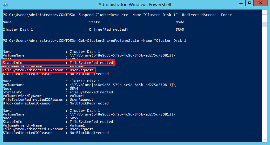Suspend-ClusterResource -Name ″Cluster Disk 1″ -RedirectedAccess -ForceТеперь CSV на всех узлах кластера находится в состоянии FileSystemRedirected, а в качестве причины указан запрос пользователя (UserRequest).
