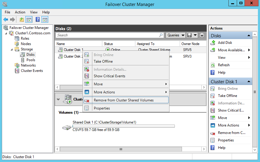 Удалить диск из CSV так же просто, как и добавить — надо просто открыть контекстное меню для диска и выбрать «Remove from Cluster Shared Volumes».