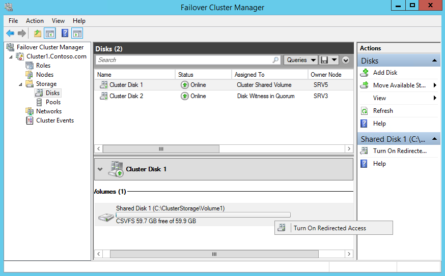 Для включения перенаправления надо выбрать нужный том CSV, кликнуть на нем правой клавишей и нажать «Turn On Redirected Access».