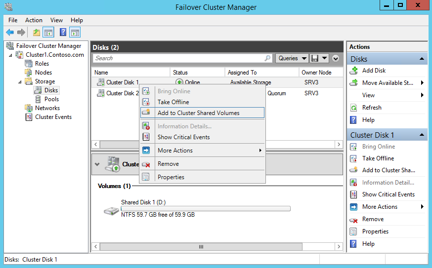 Теперь кликаем на диске правой клавишей мыши и в контекстном меню выбираем пункт «Add to Cluster Shared Volumes».