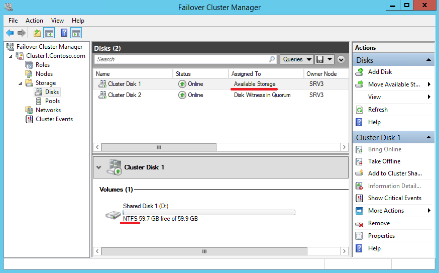 Запускаем оснастку Failover Cluster Manager, открываем нужный кластер, переходим в раздел Storages — Disks и выбираем Cluster Disk 1. Обратите внимание, что он отображается как доступное хранилище (Available Storage), в качестве файловой системы у него NTFS
