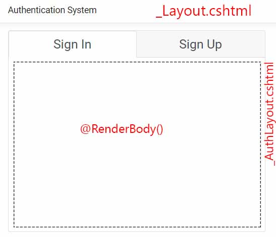 Прежде всего, у нас есть основной макет (_Layout.cshtml), а затем внутри него вложенный макет (_AuthLayout). Вместо @RenderBody() мы должны показывать html с соответствующих бритвенных страниц на основе URL-адресов. Это может быть страница входа или регистрации. Внутри раздела сценария, на основе текущего URL-адреса, мы добавили класс «активный» к соответствующему заголовку вкладки.