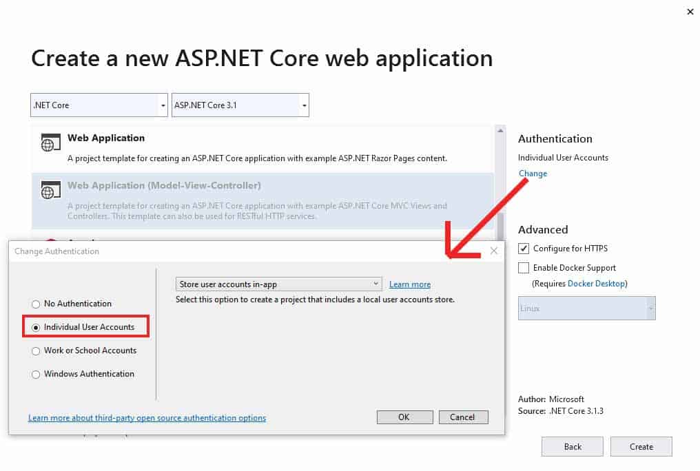 ASP.NET Core MVC с аутентификацией пользователя можно легко выполнить с помощью Identity.UI . При создании проекта MVC вам просто нужно выбрать аутентификацию в качестве отдельных учетных записей пользователей.
