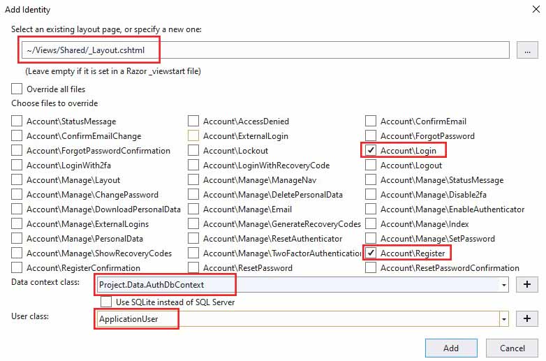 С помощью этого окна мы пытаемся переопределить выбранные операции из Identity. Здесь я выбрал «Войти и зарегистрироваться», чтобы продемонстрировать вам, насколько мы можем настроить API. По умолчанию для страниц идентификации выбран файл _Layout.cshtml . Теперь укажите имена классов C# для контекста данных и пользовательской модели, используя кнопку + справа. Наконец, нажмите Добавить. Затем в каталог проекта будет добавлена новая область идентификации с выбранными страницами и соответствующими файлами.