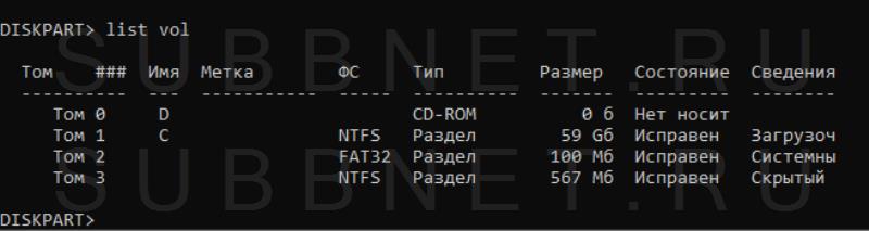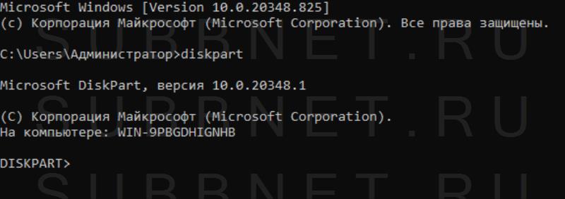 Для запуска DiskPart в командной строке набираем