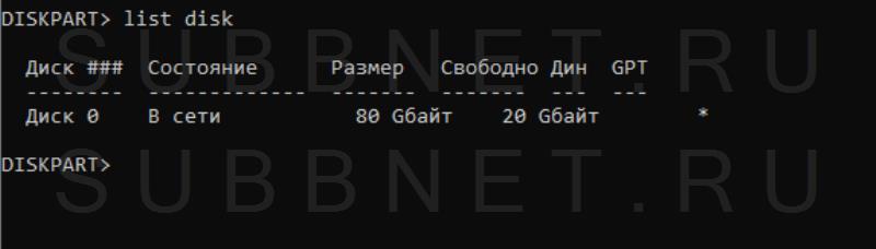 Обратите внимание, у нас было свободного пространства 20 Gb, это было видно когда мы выводили информацию по дискам list disk