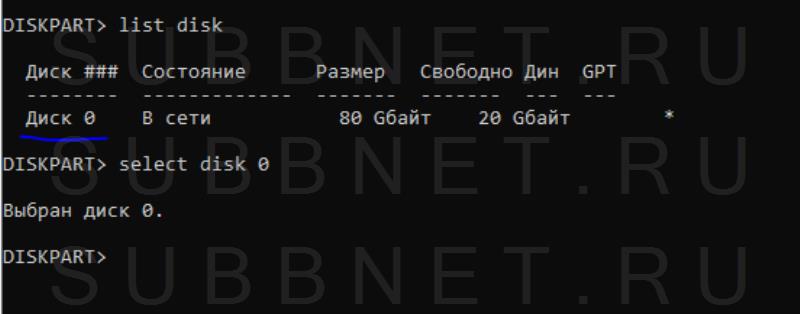 Выбираем диск, в нашем случае это диск 0