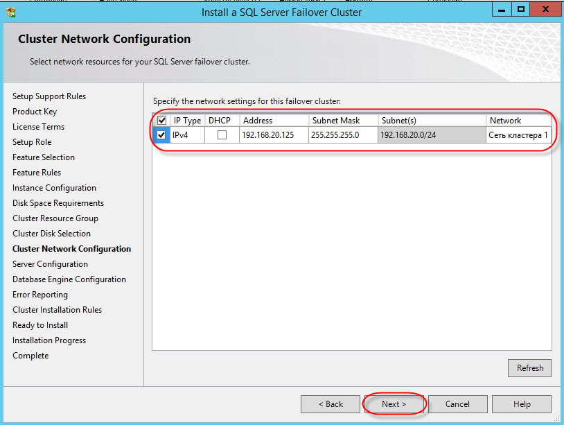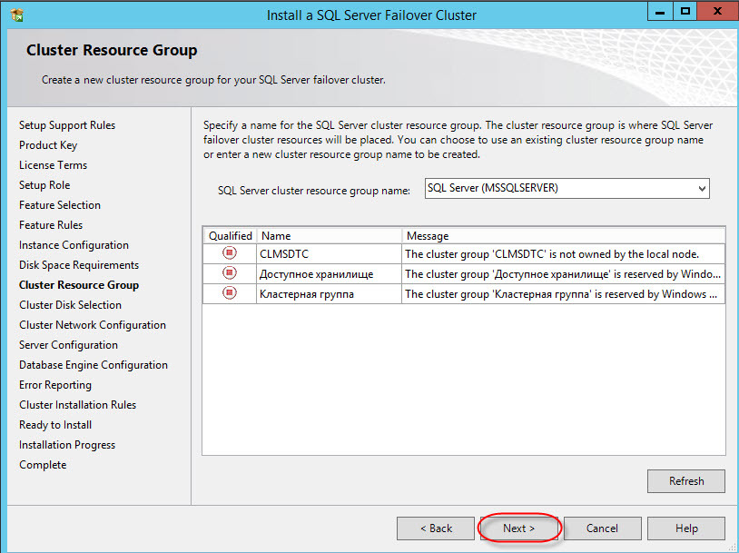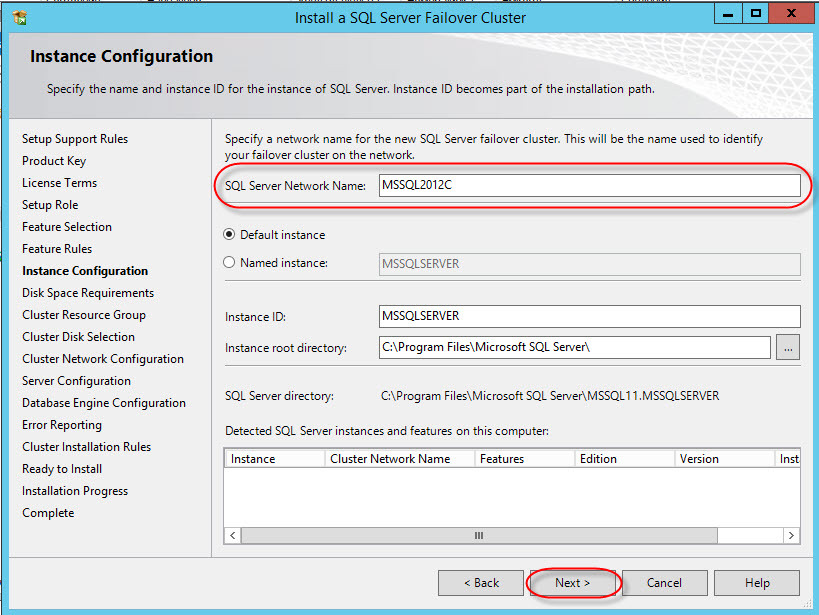 Далее — важный этап, выбор сетевого имени для кластера MSSQL (instance ID – оставляем):
