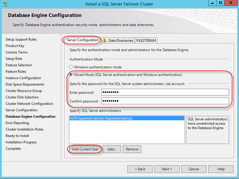 Указываем данные администратора (можно завести отдельного пользователя для MSSQL):