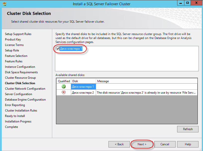 Выбираем диск для расположения баз данных кластера: