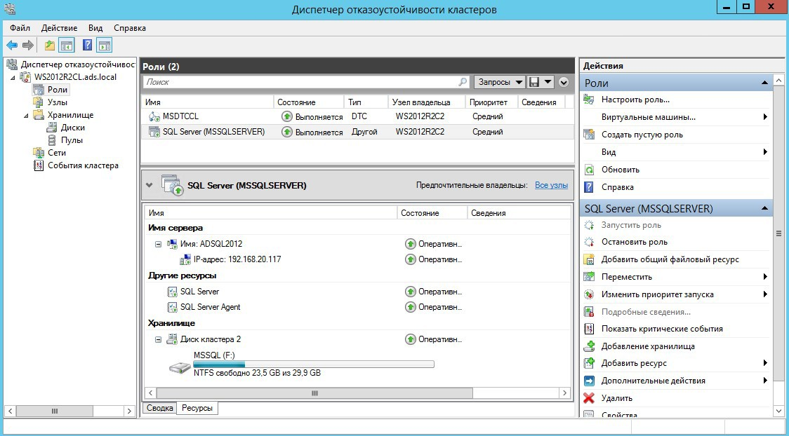 Удостоверимся, что все работает как надо. Для этого перейдем в оснастку «Диспетчер отказоустойчивого кластера»: