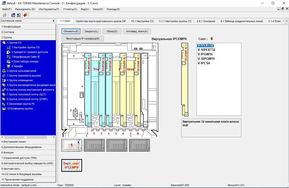 Идем в 1.1 (Конфигурация — слот), выбираем Виртуальный слот IPCMPR. Перетаскиваем в первый виртуальный слот плату V-SIPGW16.