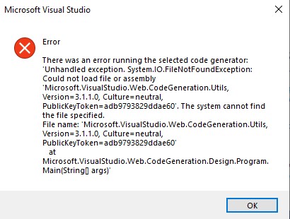 Если вы столкнулись со следующей ошибкой при создании файла controller. вам следует повторить попытку после установки пакета NuGet — Microsoft.VisualStudio.Web.CodeGeneration.Utils.
