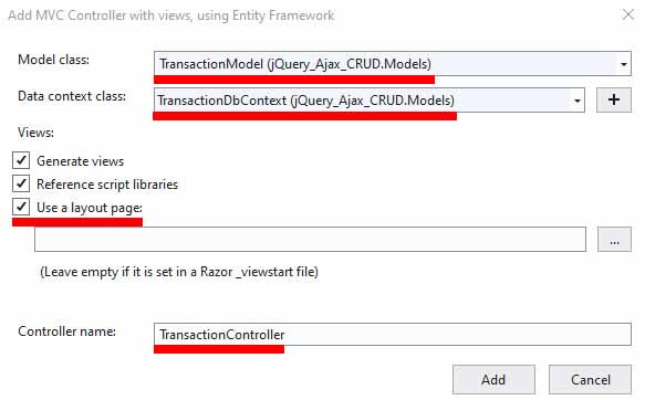 Теперь давайте добавим контроллер MVC с методами действий для операций CRUD. Для этого щелкните правой кнопкой мыши папку «Контроллеры» , «Добавить»> «Контроллер». Затем выберите «Контроллер MVC с представлениями, используя Entity Framework» . Заполните окно соответствующими данными.