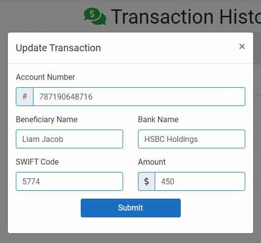 </footer>Внутри showInPopup метода мы сделаем запрос GET к данному URL-адресу, а запрос-ответ будет сохранен внутри modal-bodydiv. мы открыли модель Bootstrap с помощью modal функции. Эта showInPopup функция вызывается для добавления новых транзакций с помощью кнопки заголовка таблицы, а также с помощью кнопки редактирования/обновления, чтобы отобразить детали конкретной транзакции для операции обновления.