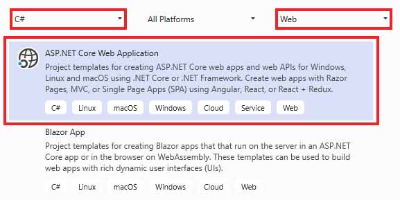 В новом окне проекта выберите Asp.Net Core Web Application .