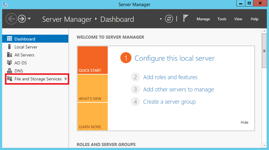 Процедура включение ABE крайне проста. Для настройки на отдельном сервере открываем Server Manager и на главной странице выбираем роль сервера «File and Storage Services».