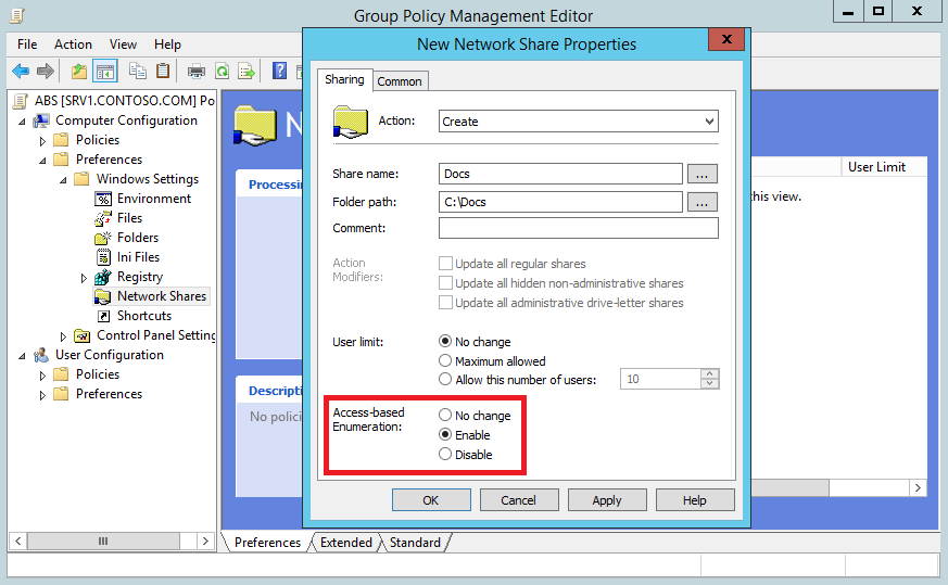 При управлении общими папками централизованно, через предпочтения групповых политик (Group Policies Preferences), в свойствах папки также есть возможность указать, будет ли включен для нее ABE.