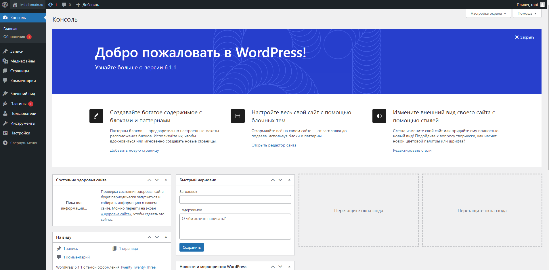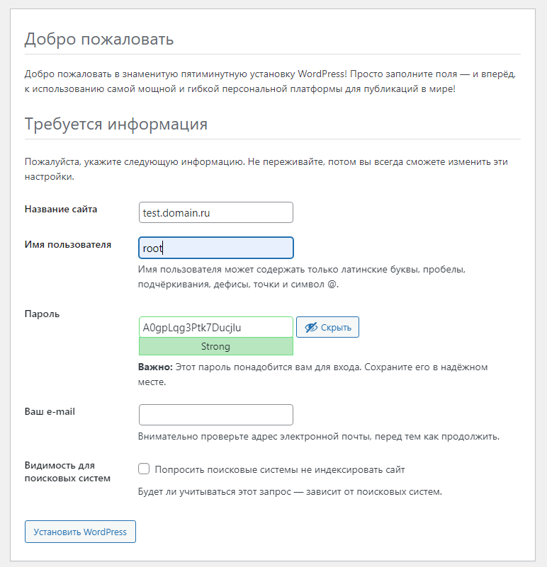 mkdir /opt/wordpressСоздадим на сервере MySql базу для будущего сайта test.domain.ru