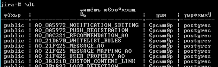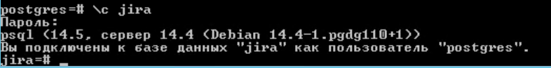 Следующая команда подключается к jira базе данных под postgres пользователем: