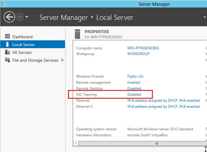 Объединить несколько сетевых карт в одну крайне просто. По умолчанию, режим NIC Teaming в Win 2012 отключен. Для его активации откройте консоль управления Server Manager, выберите локальный сервер (Local Server) и в его свойствах выберите пункт «NIC Teaming: Disabled».