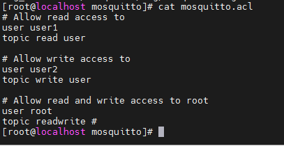 Директива topicпозволяет текущему пользователю читать, записывать или читать и записывать (оба одновременно) заданную тему. MQTT как протокол построен на идее публикации (записи) или подписки (чтения) тем. Mosquitto предполагает, что у пользователя вообще нет доступа, если не topicприсутствует одна или несколько директив, разрешающих доступ.
