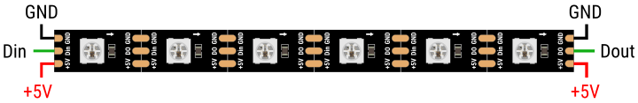 Лента WS2812B имеет три площадки для пайки на обоих концах. Вы можете припаять штыревые контакты, провода или трехконтактные разъемы к этим площадкам для пайки. В начале полосы у него есть контакты VCC, Ground и Din, а в конце полосы у него есть контакты VCC, Ground и Dout.
