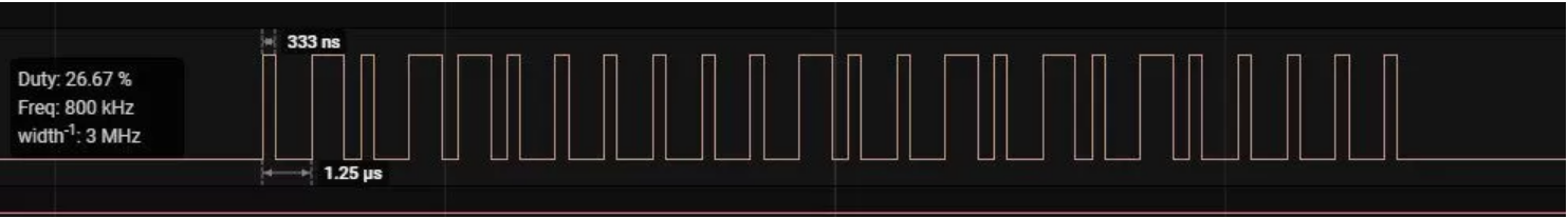 Две ножки питания, вход и выход. Команда приходит на входную ножку в виде последовательности 24 битов, по 8 на каждый цвет. Так как синхроимпульс отсутствует, ноль и единица отличаются длительностью: 0,4 мкс - ноль, 0,85 - единица. На один бит тратится 1,25 мкс, на один светодиод команда передается, соответственно, за 30 мкс. Скорость передачи, таким образом, составляет 800 кбит/с. В каждом чипе, в качестве конкретно ему адресованной команды, остается последние перед завершением передачи 24 бита, все предыдущие он транслирует на выход, передавая информацию по цепочке дальше. Окончанием пакета данных является пауза на низком уровне в течение 50 мкс, после чего каждый чип формирует сигналы на своих светодиодных ножках согласно “замершей” в нем информации. Цвет установлен и будет сохраняться до приема следующей команды.