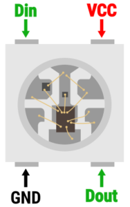WS2812B имеет схему управления и микросхему RGB, интегрированную в пакет из 5050 компонентов. Этот пакет содержит четыре контакта — VCC, Ground, DIN и DOUT.