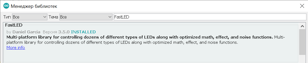Подождите, пока менеджер библиотек загрузится должным образом. Затем найдите «fastled» . Там вы найдете пару записей. Выберите нужную библиотеку и нажмите «Установить».