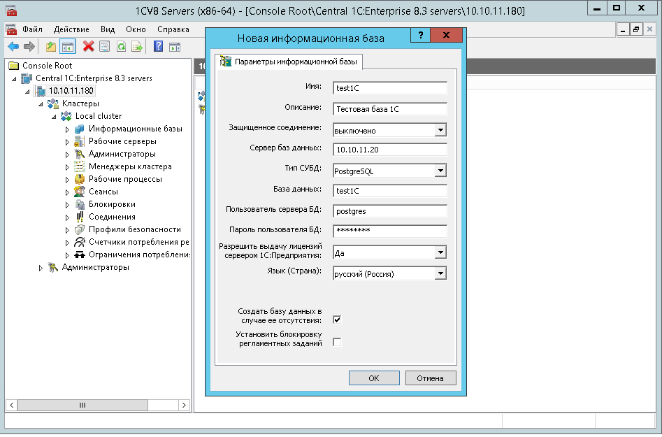 При необходимости можно отметить пункт «Создать базу с случае ее отсутствия»
