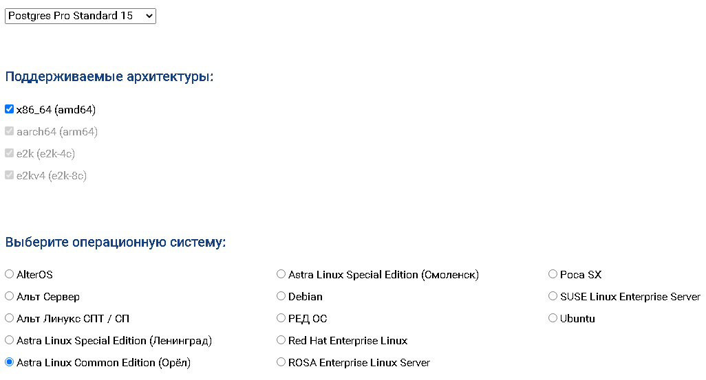 Установка и настройка PostgreSQL на примере ОС Astra Linux Common Edition (Орёл). Для каждого отдельного случая инструкция меняется. Для получения инструкции необходимо пройти на сайт разработчика PostgresPro, зарегистрироваться, принять условия лицензии, выбрать систему для установки из списка и получить инструкцию.