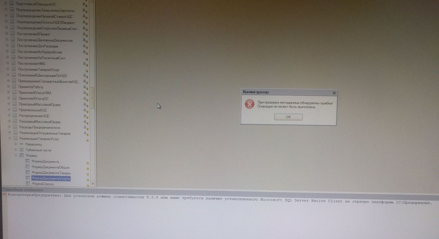 После обновления на сервере sql платформы до 8.3.8 или выше, может появиться следующая ошибка в 1с. Во время объединения конфигураций появляется ошибка «При проверке метаданных обнаружены ошибки! Операция не может быть выполнена.»