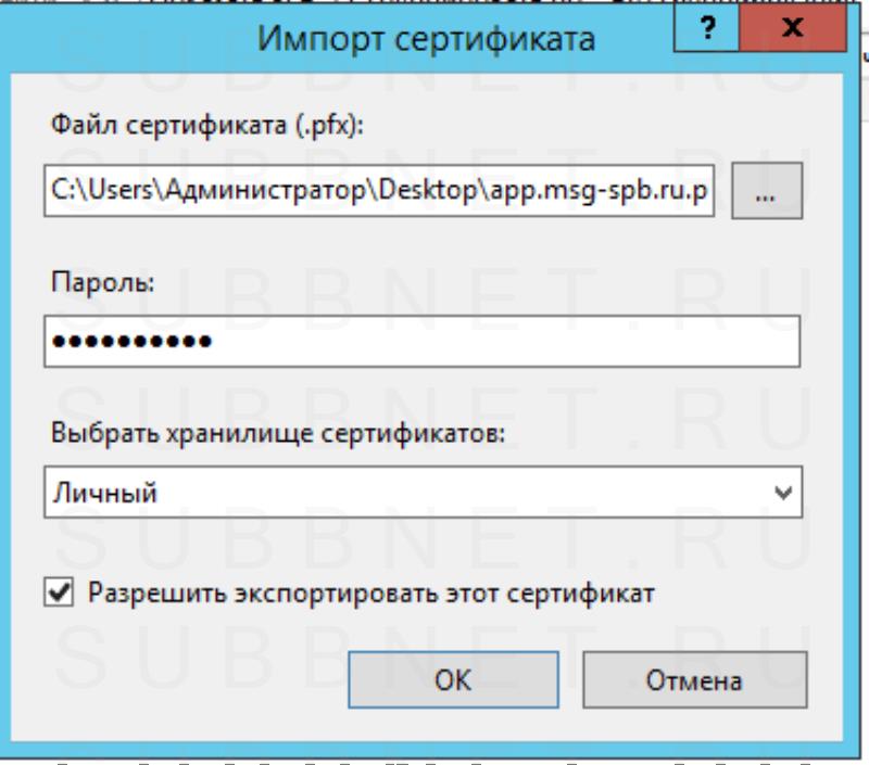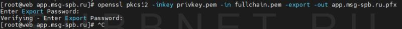 openssl pkcs12 -inkey privkey.pem -in fullchain.pem -export -out app.msg-spb.ru.pfxСистема запросит ввести пароль, чтобы защитить цепочку сертификатов — вводим сложный пароль дважды.